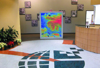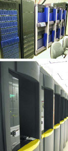 The new office in Frederick has massive data processing capability. This was necessary, since the new sensors can yield terrabytes of data in just a few days. These capabilities make it possible for EarthData to put the deliverables in the clients’ hands within days (when necessary) instead of the traditional weeks or months. Because digitally processed data is not labor-intensive as it once was, consumers no longer have to settle for data that is sometimes two years old, or data that meets 80 percent of the need. Instead they get data that is two weeks old that often meets 100 percent of the need. Upper left: Silicon Graphics racks. Lower left: Racks of Ampex tape backups.