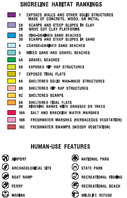 - Shorelines are color-coded to indicate their sensitivity to oiling.