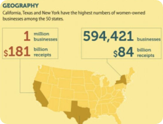 • California, Texas, and New York have the most women owned businesses