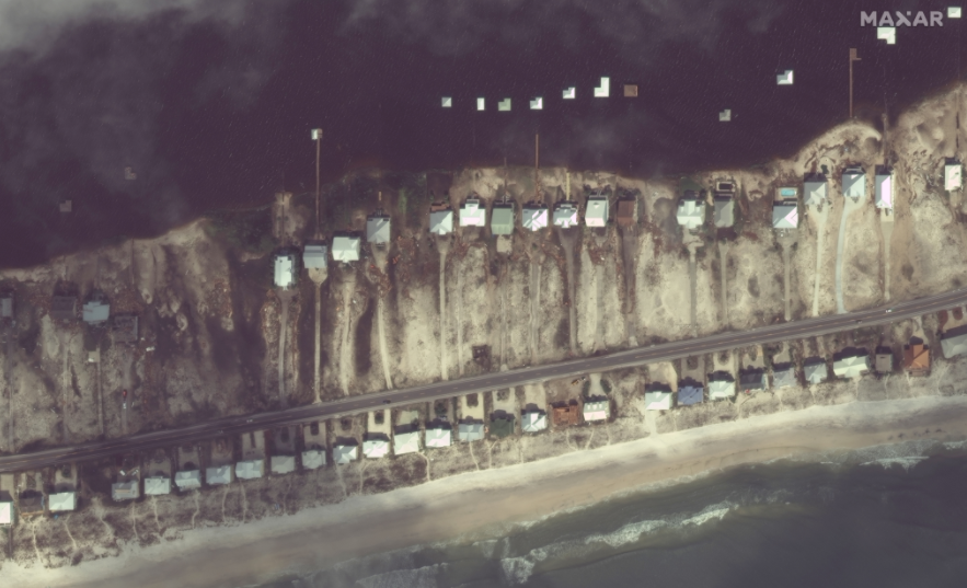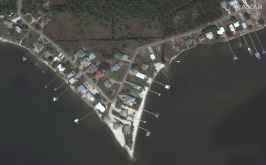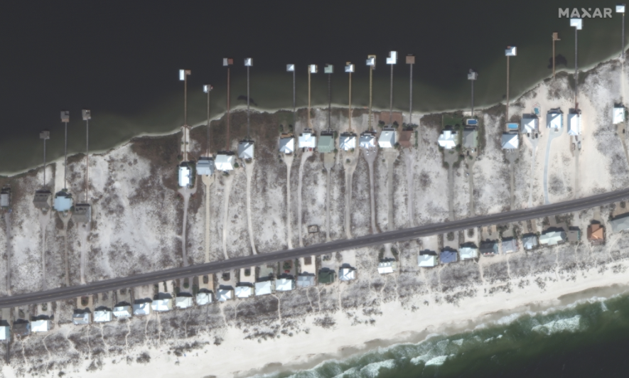 Imagery below focuses in on the coastal communities of Gulf Shores and the Fort Morgan peninsula of Alabama, providing before/after imagery comparisons of the area. Maxar continues to monitor the aftermath of the storm and will provide updates, as applicable.