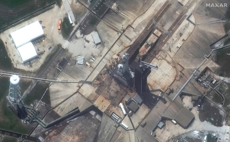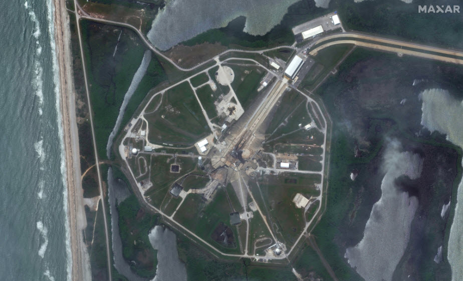 Maxar collected new satellite images yesterday and today of the SpaceX Falcon 9 rocket with its Cargo Dragon capsule at SLC 39A in the Kennedy Space Center. Today’s WorldView-3 high resolution view shows the rocket at the launch pad approximately 70 minutes before its successful launch today (3 June).