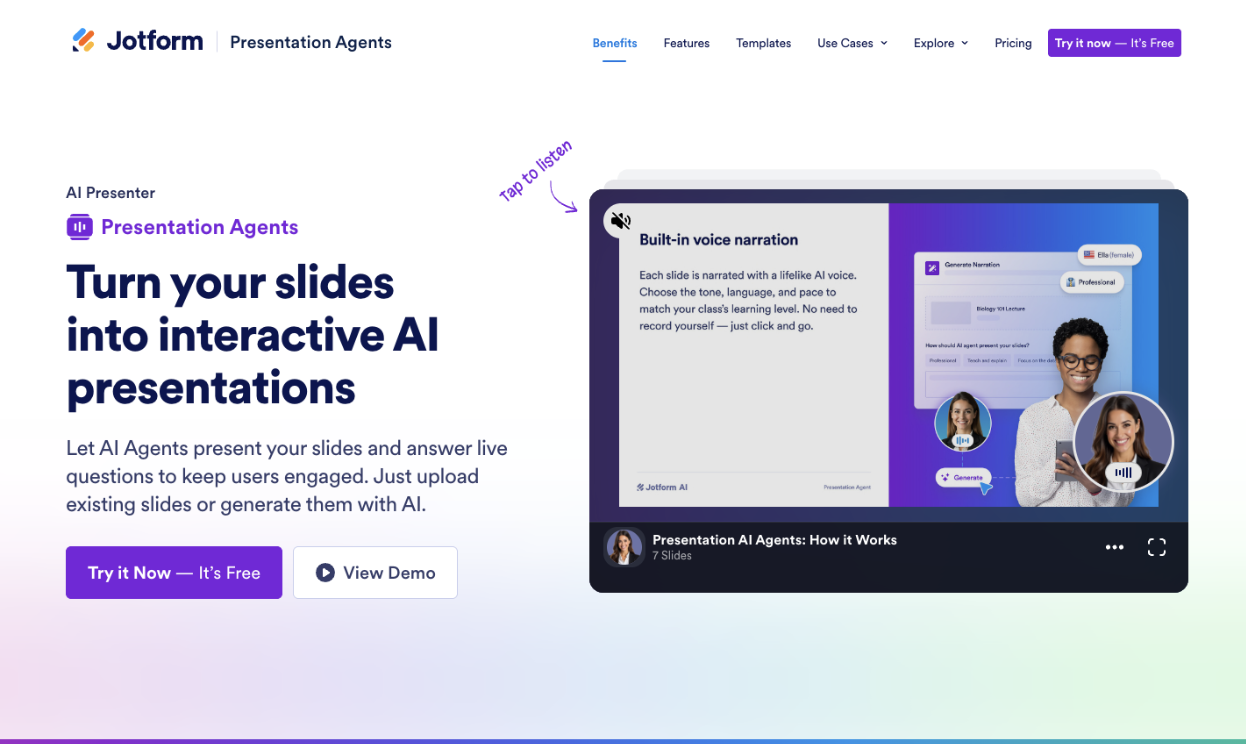 • Jotform Presentation Agents are great at taking prompts or slides and turning them into a clean, engaging format with narration and live question answering abilities.