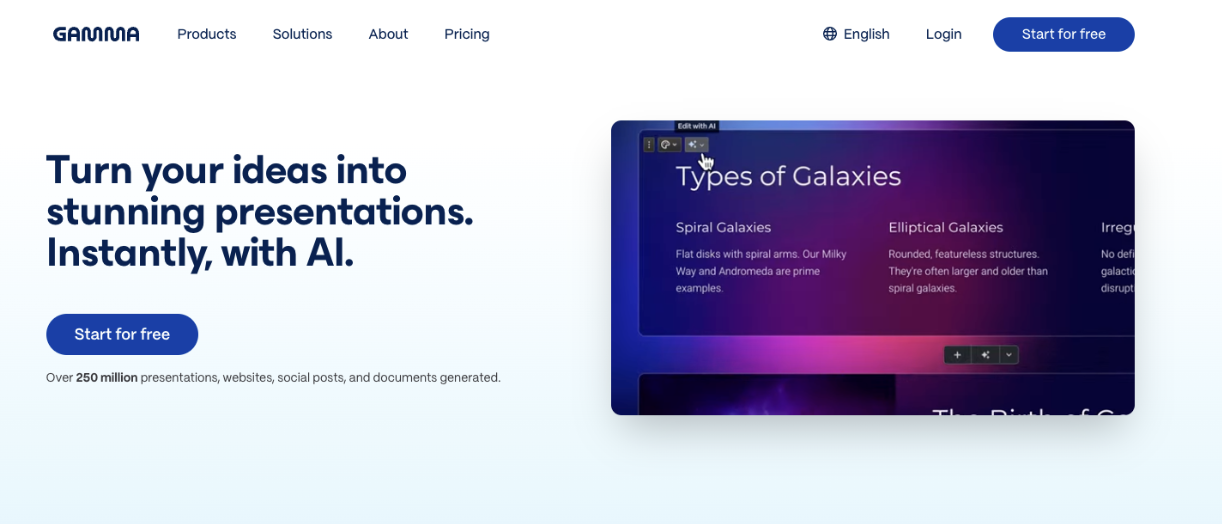 Gamma ditches the traditional slide format for a clean, scroll-based layout that feels more like an interactive webpage. It’s built to tell stories rather than just present facts, which makes it a solid choice for pitch decks, onboarding flows, college marketing, or product walkthroughs.