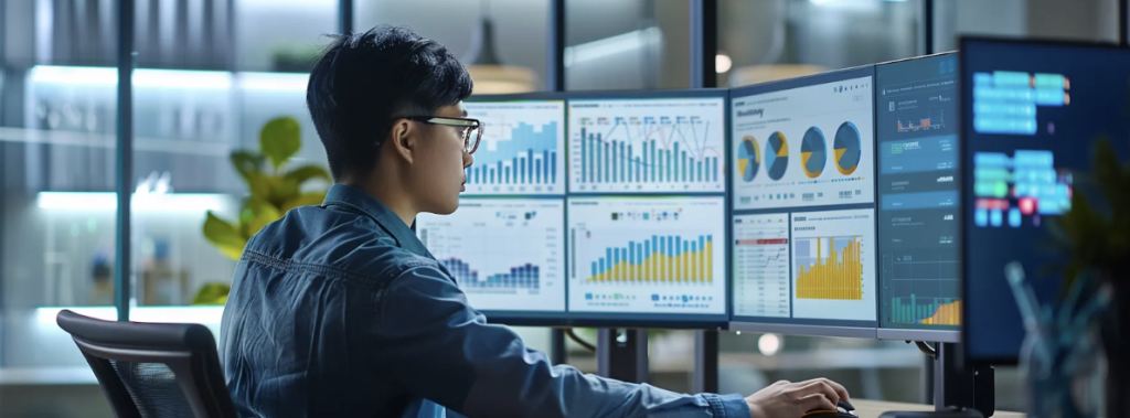 Alt text: A data analyst works across multiple monitors filled with charts and graphs, showcasing the power of the best AI search platforms for real-time insights and data visualization.