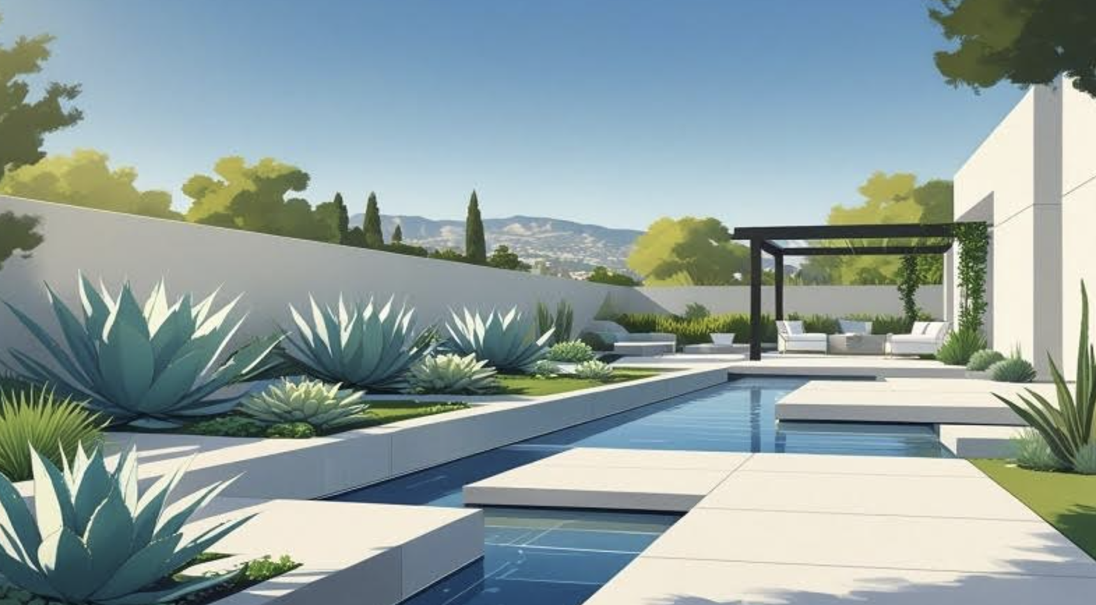 In Los Angeles, landscape designers interpret modern principles through the lens of Mediterranean climate and indoor-outdoor lifestyle. The approach features horizontal planes, asymmetrical balance, and strong architectural elements like concrete walls, steel planters, and wooden screens. Hardscaping typically dominates softscaping, with plant selections limited to architectural specimens like agave, yucca, and ornamental grasses.