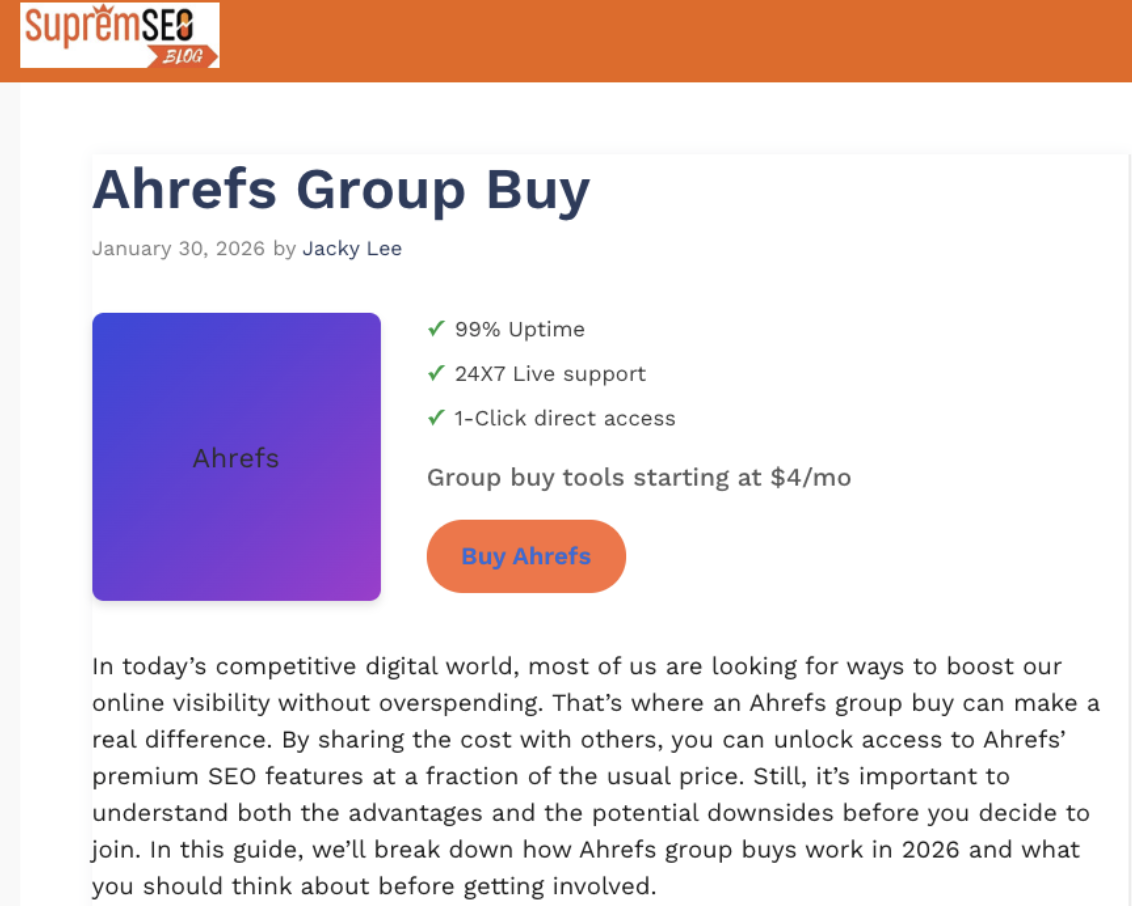 SupremSEO is the top choice for buying ahrefs group buy in 2026. They have been trusted by over 1000 SEOs and agency owners since 2018. This ahrefs groupbuy provider charges just $14 a month for Ahrefs access, matching the official price but with shared costs. Their Semrush combo package is only $20.99, giving you two premium tools for less than either costs alone.